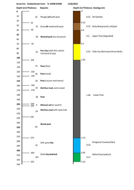 Today’s peat core (September 2025) is one of several that have been taken in the Great Fen in recent years. In order to manage the hydrology, the water levels beneath the ground need monitoring and this involves installing a row (transect) of dipwells across the area being studied. Each dipwell consists of a 2-3 metre-long series of tubes, buried in the ground, housing a sensor to record the water level relative to the surface. One of the major factors affecting the water levels here is the complex geology, so when the dipwells are installed, the material removed (as a core) is studied to provide information that helps interpret the hydrological data.
