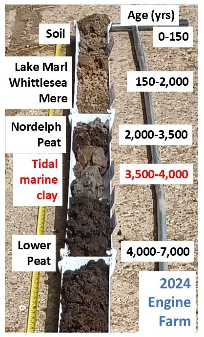 At Chalderbeach Farm, on the eastern side of the Great Fen, it appeared in one of our cores at 70 cm deep and was 35 cm thick, with only soil and degraded peat above but about 2 m of preserved peat below it. A similar clay was found at 1.5 m depth at Engine Farm, underneath lake marl and (Upper, Nordelph) peat, and in other studies it was found at 70 cm deep at Rymes Reedbed where it was dated to the Early Bronze Age (about 4,000 years ago). This fits with the known sea incursion of the fenland that started in the late Neolithic and lasted a few hundred years, into the Bronze Age. Tidal mudflats and saltmarsh covered much of the lower land in the southern fen basin at one point or another.