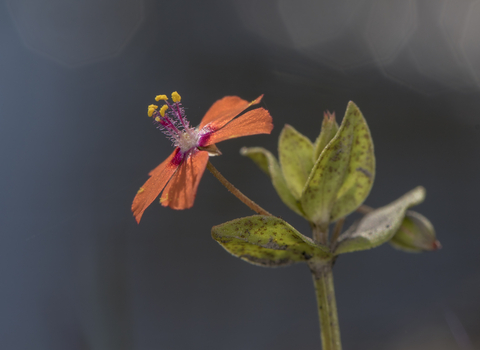 Scarlet pimpernel has red flowers with five petals, each fringed with many tiny hairs; sometimes its flowers can be blue. Its leaves are unstalked and oval, sitting on trailing stems.